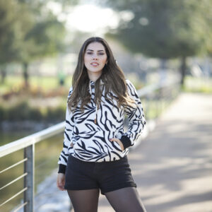 $22.990Modelo que lleva un estampado print, semi entallado, mangas largas y su cuello cerrado en puño, lleva cierres laterales para la facilitación de la lactancia.