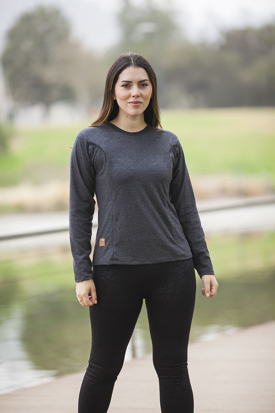 Modelo semi entallado, mangas largas y cuello cerrado en puño. Lleva cierres laterales para la facilitación de la lactancia.