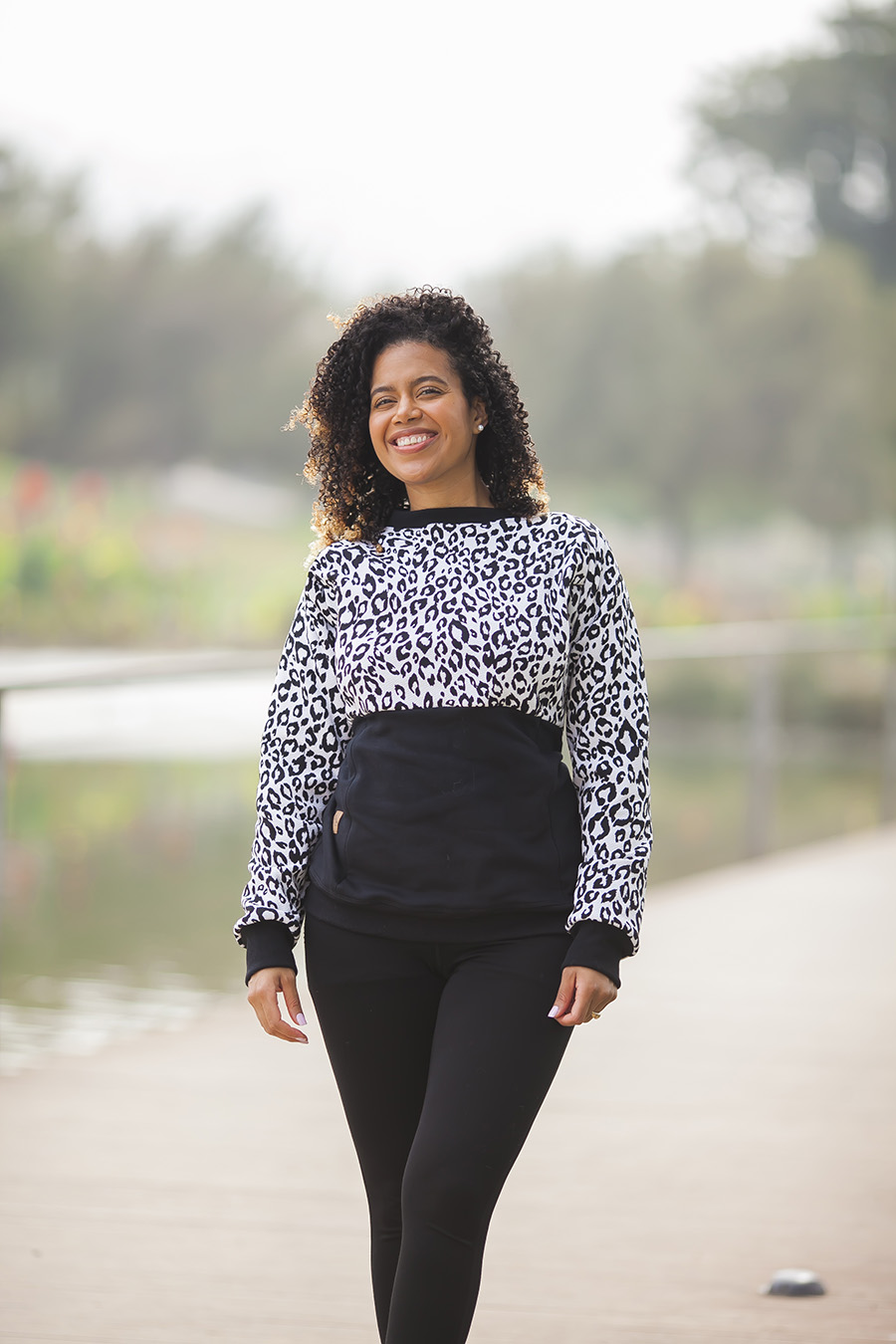 Modelo combinado en dos telas, recto con terminación en puño, cuello cerrado en puño, bolsillos y cierres laterales para facilitar la lactancia.