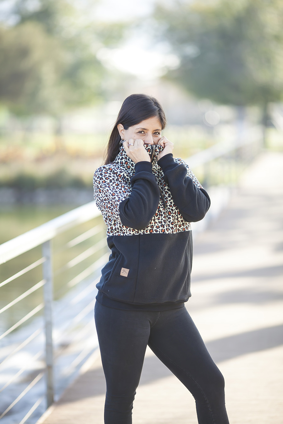 Modelo combinado en dos telas, recto con terminación en puño, cuello alto con cierre medio, lleva bolsillos y cierres laterales para facilitar la lactancia.