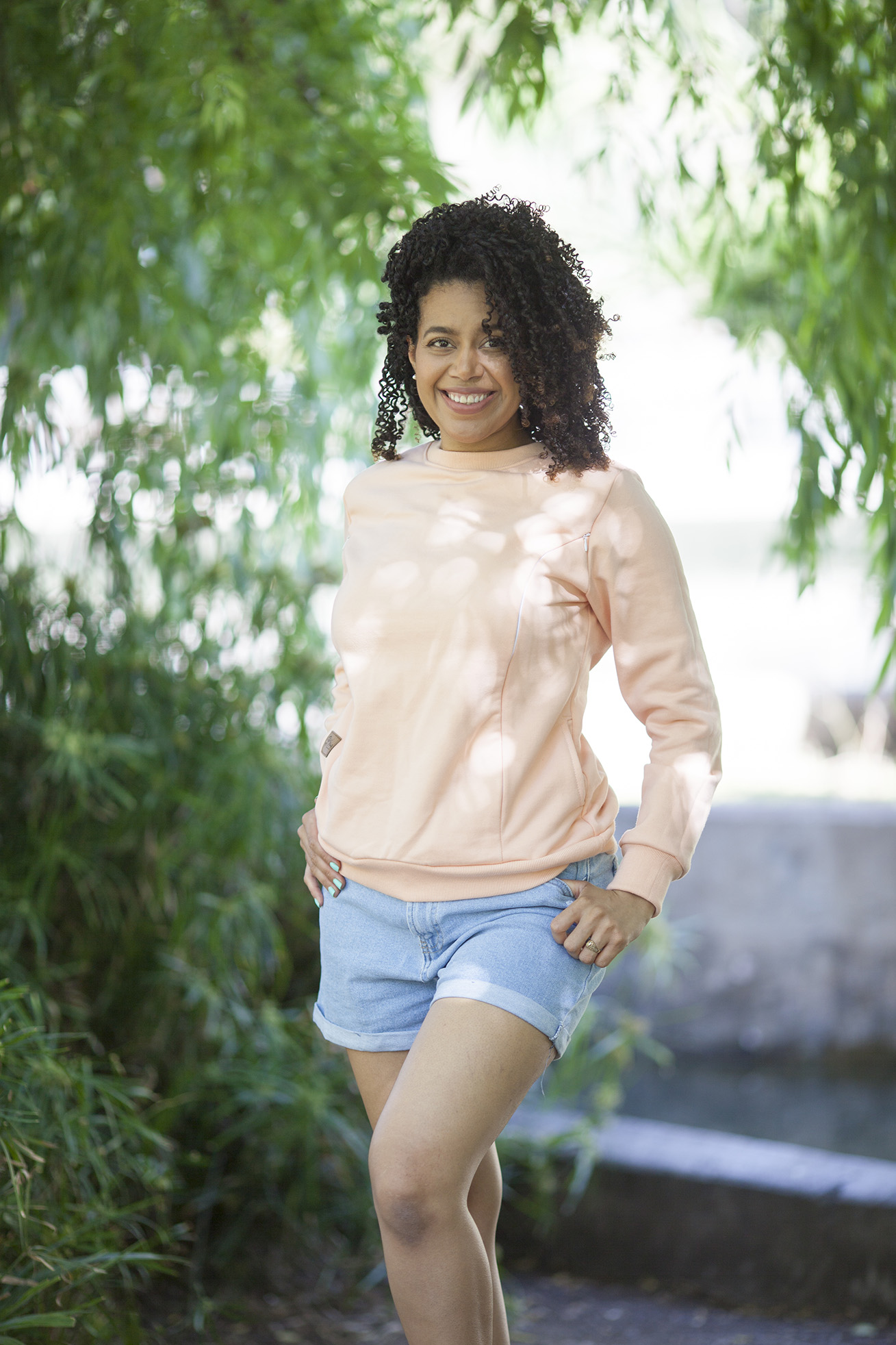 Modelo recto con terminación en puño y cuello cerrado en puño. Bolsillos y cierres laterales para facilitar la lactancia.