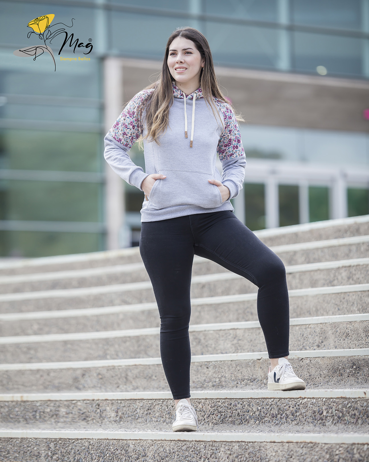 Modelo combinado en dos telas, recto con terminación en puño, gorro. Bolsillo canguro con cierres laterales para facilitar la lactancia.