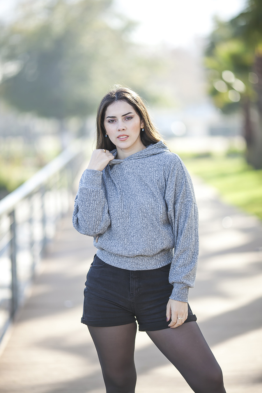 Modelo englobado con terminación de puño alto, con gorro y sus mangas murciélago. Bolsillos y cierres laterales para facilitar la lactancia.