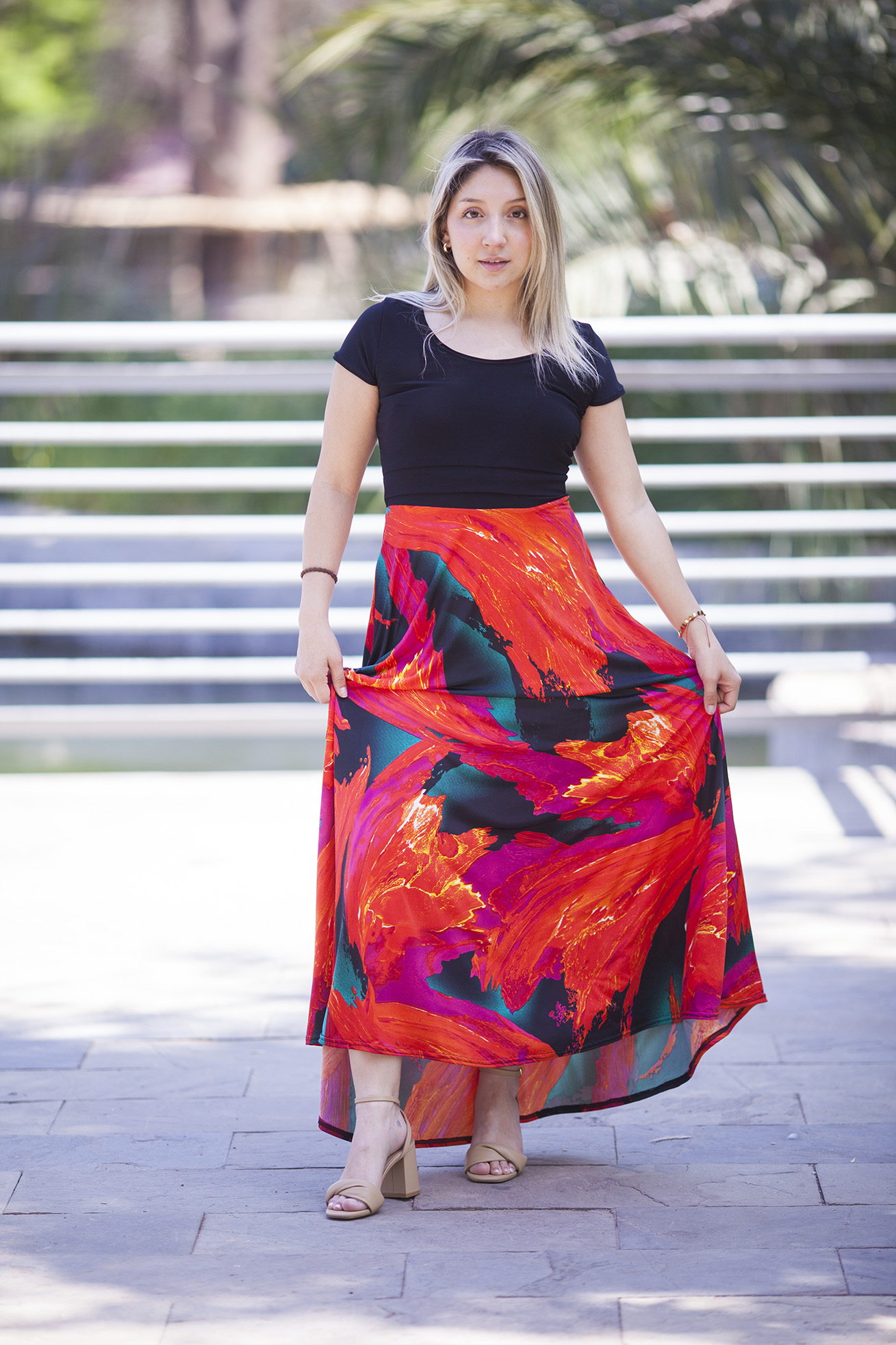 Modelo entallado hasta bajo busto, unido con una Maxi falda acampanada, escote redondo y mangas cortas. Lleva abertura de lactancia. Envianos el largo que deseas desde bajo el busto hasta 110 cm