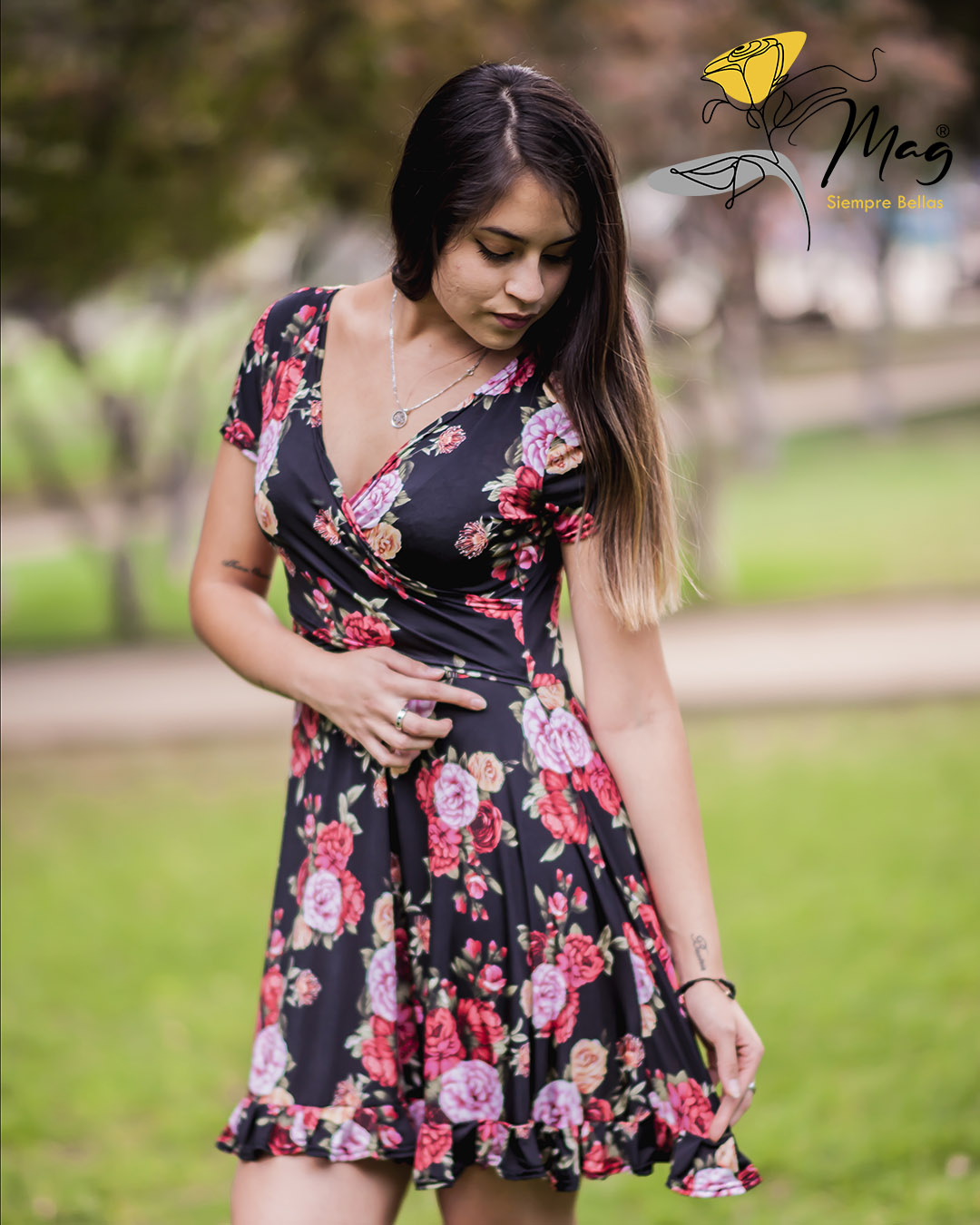 Modelo entallado hasta bajo busto, unido con una falda acampanada con terminación en vuelos. Escote cruzado y mangas cortas. Lleva abertura de lactancia. Envíanos el largo que deseas desde bajo el busto hasta 65 cm